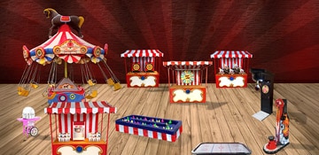 Composez votre fête foraine : manège, stand kermesse, pêche aux canards dans un style traditionnel ou plus année 80 avec la mailloche, le coup de poing.